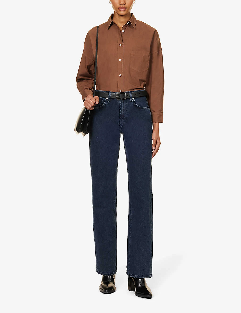 - Regular fit, high-rise, straight leg, belt loops, five pockets, brand patch at back, straight cuffs