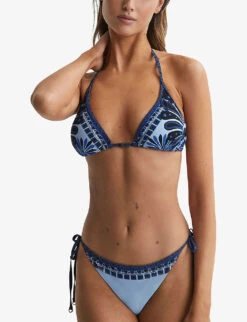 - Halter neck, adjustable neckties, cut-out detail at front, open back, branded hardware at back, all-over shimmer fabrication, medium coverage