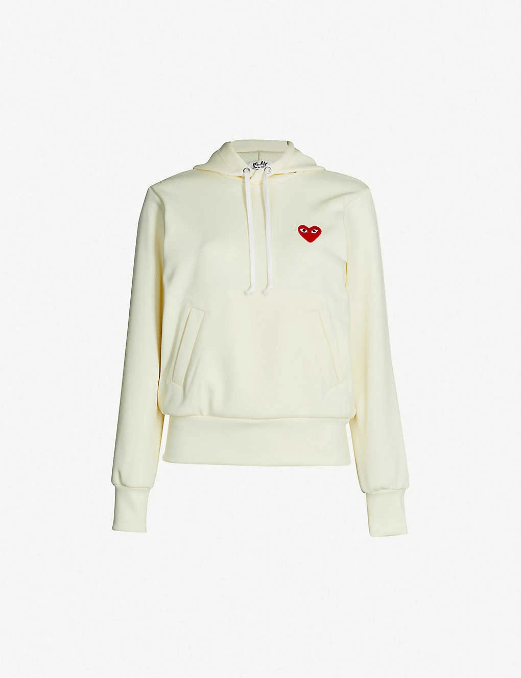 Comme des Garçons PLAY jersey hoody Slips on Drawstring hood, long sleeves, heart-shaped logo appliqué at chest, welt pockets at front, ribbed trims 100% polyester Machine wash cold True to size Size small: length 24″” Model is 5ft 10″” and wears a size small Made in Japan
