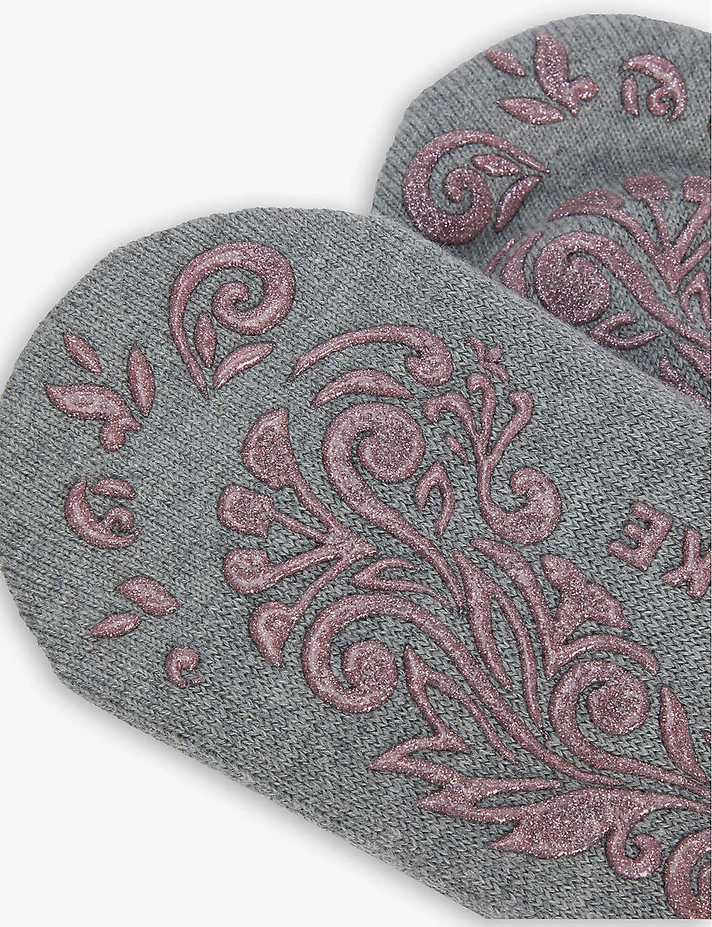 - Ankle length, folded panels at ankle with striped trim, knitted panels, rubberised text and pattern at soles, reinforced heels and toes