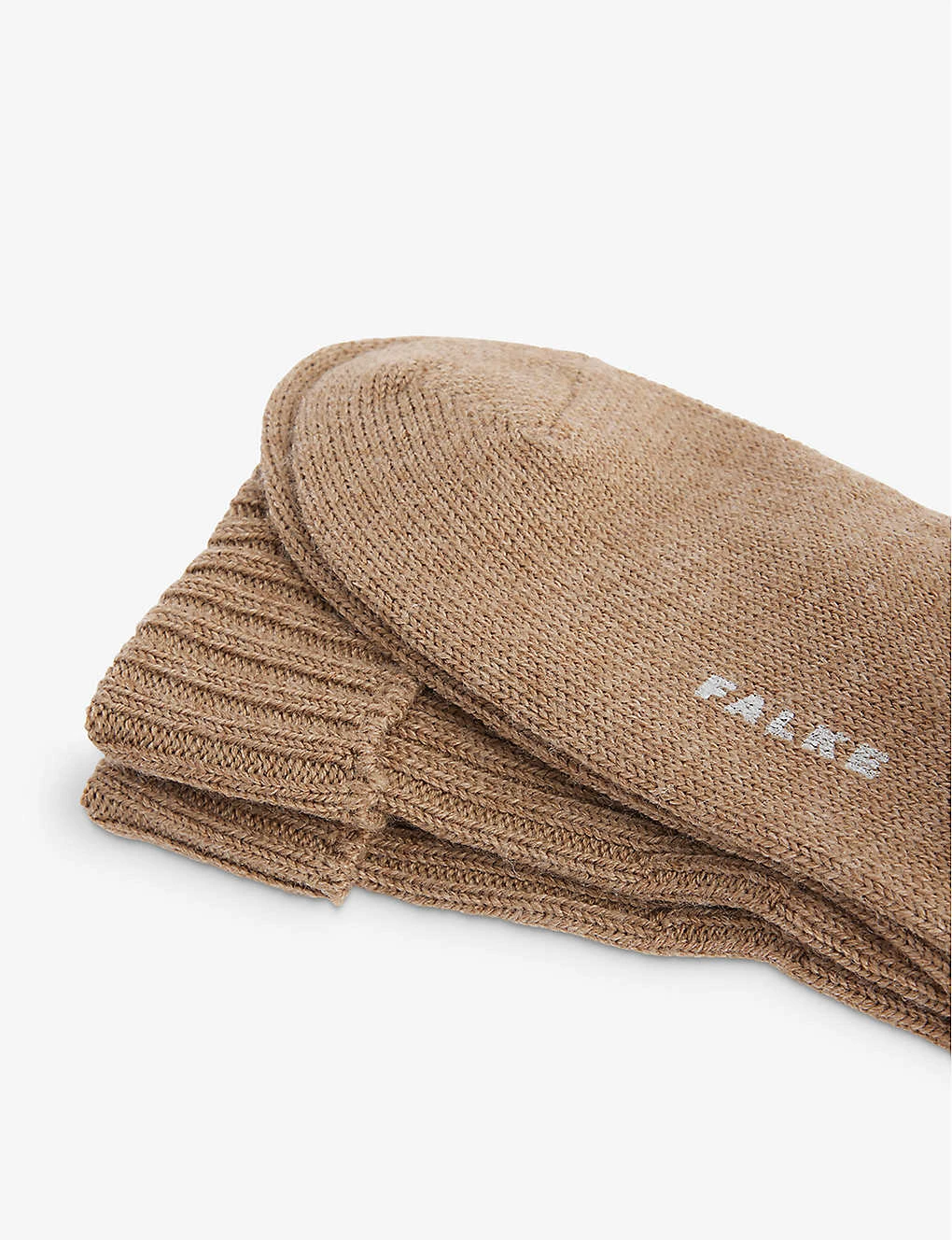 - Calf length, medium knit, chunky ribbed cuffs, branding at sole