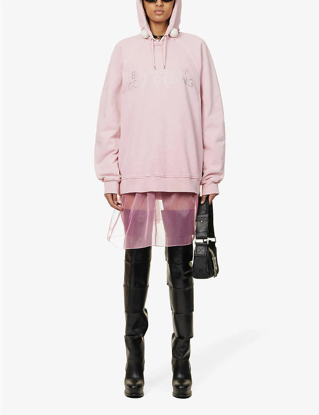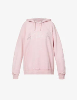 - Oversized fit, drawstring hood, long sleeves, brand rhinestone pattern at front and back, faded wash, ribbed trims