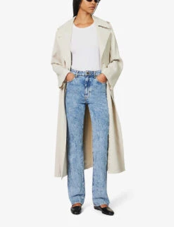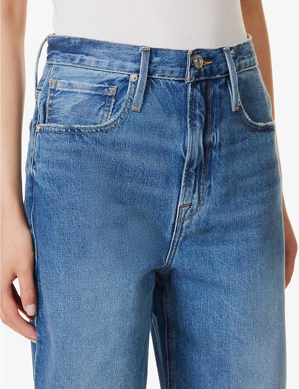 - Regular-fit, high-rise, belt loops, five pockets, branded silver-toned hardware, all-over faded wash and whiskering, contrast stitching, V-shaped yoke at back, partially lined, raw hems