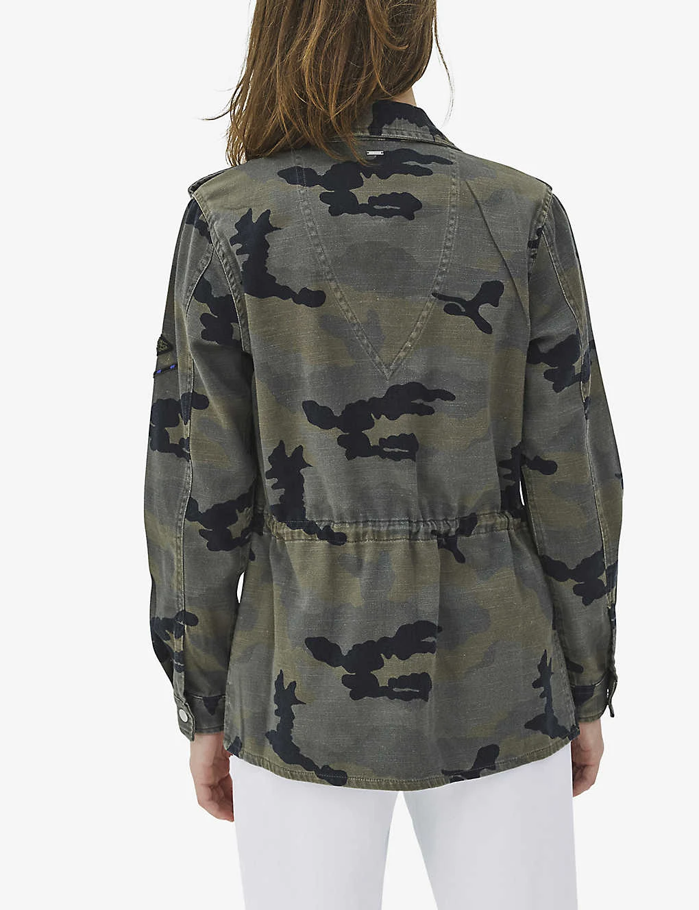 - Lapel collar, long sleeves, badges at sleeve, zipped slip pockets at front, popper fastened cuffs, two flap popper fastening pockets at front, camouflage pattern