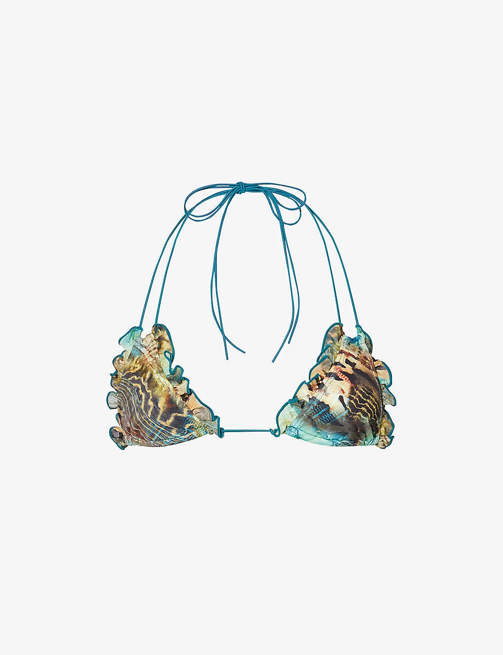 - Halter-neck, triangle cups, all-over graphic pattern, mesh ruffled trims, lined