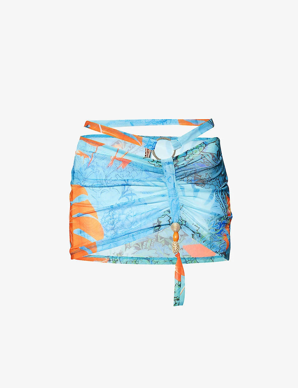 - Mid-waist, double strap waistband, O-ring at side, ruched at side, beaded strap embellishment at side, semi-sheer, all-over graphic design