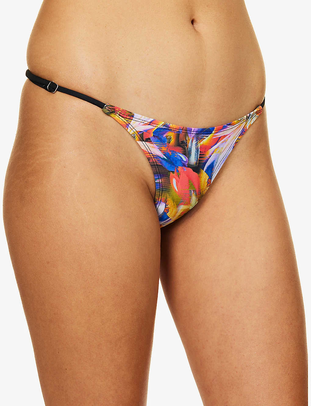 - Mid-rise, high leg, adjustable straps at sides, all-over graphic pattern, low coverage at back, lined