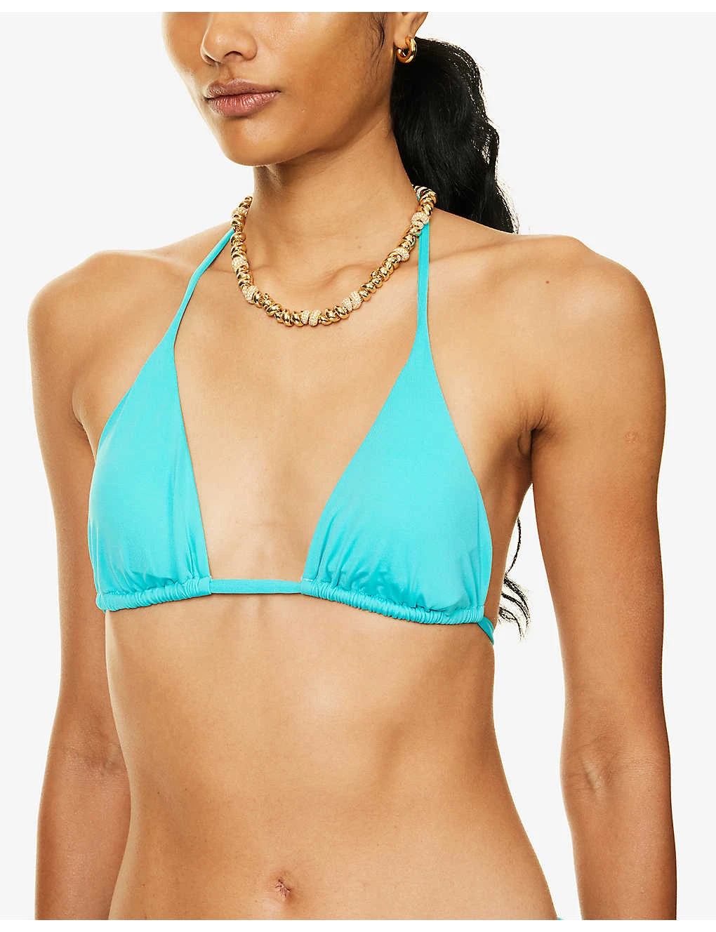 - Halterneck, V-neck, soft triangle cups, removable padding at cups, brand-engraved metallic pendants at straps