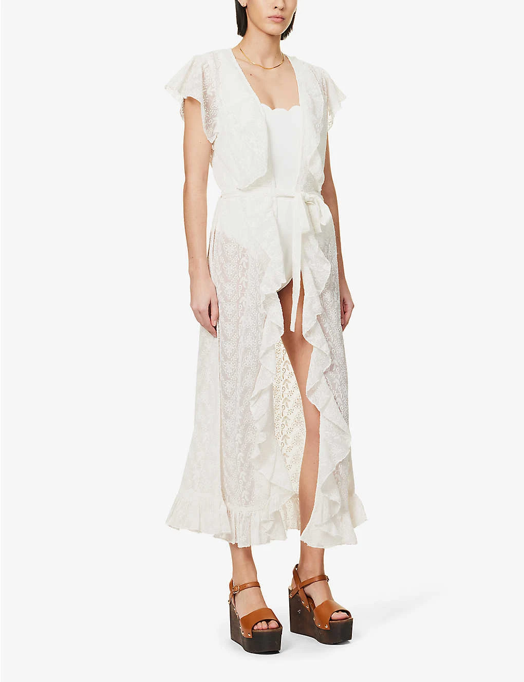 - Regular-fit, V-neck, capped sleeves, wrap-over panel at front, all-over broderie panels, belt loops, self-tie belt at waist, frilled trims