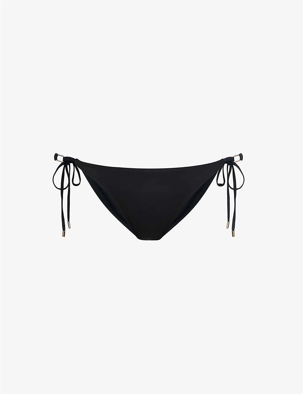 - Mid-rise, self-tie straps at sides, branded gold-toned hardware, link embellishments at straps, medium coverage at back, fully lined