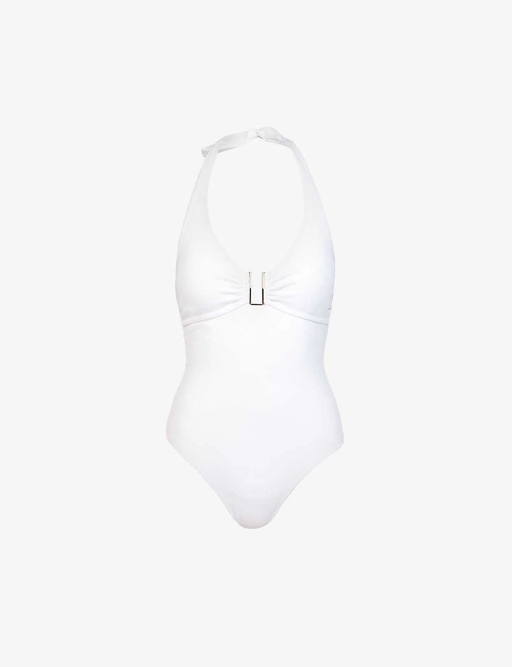 - Halter-neck, self-tie fastening at neck, plunging neckline, gold-toned hardware, detachable cups, gathered at chest, open at back, medium coverage at back, fully lined