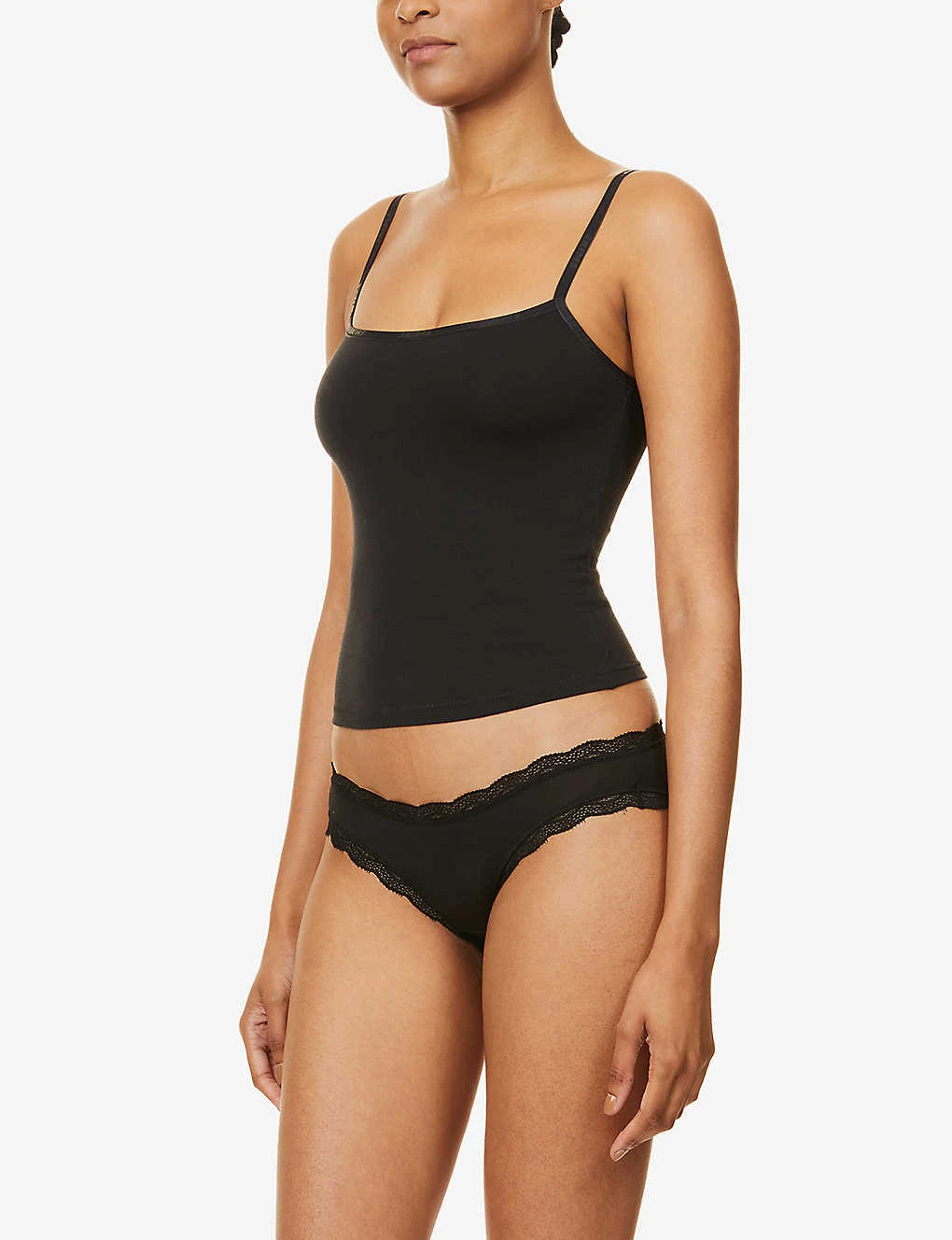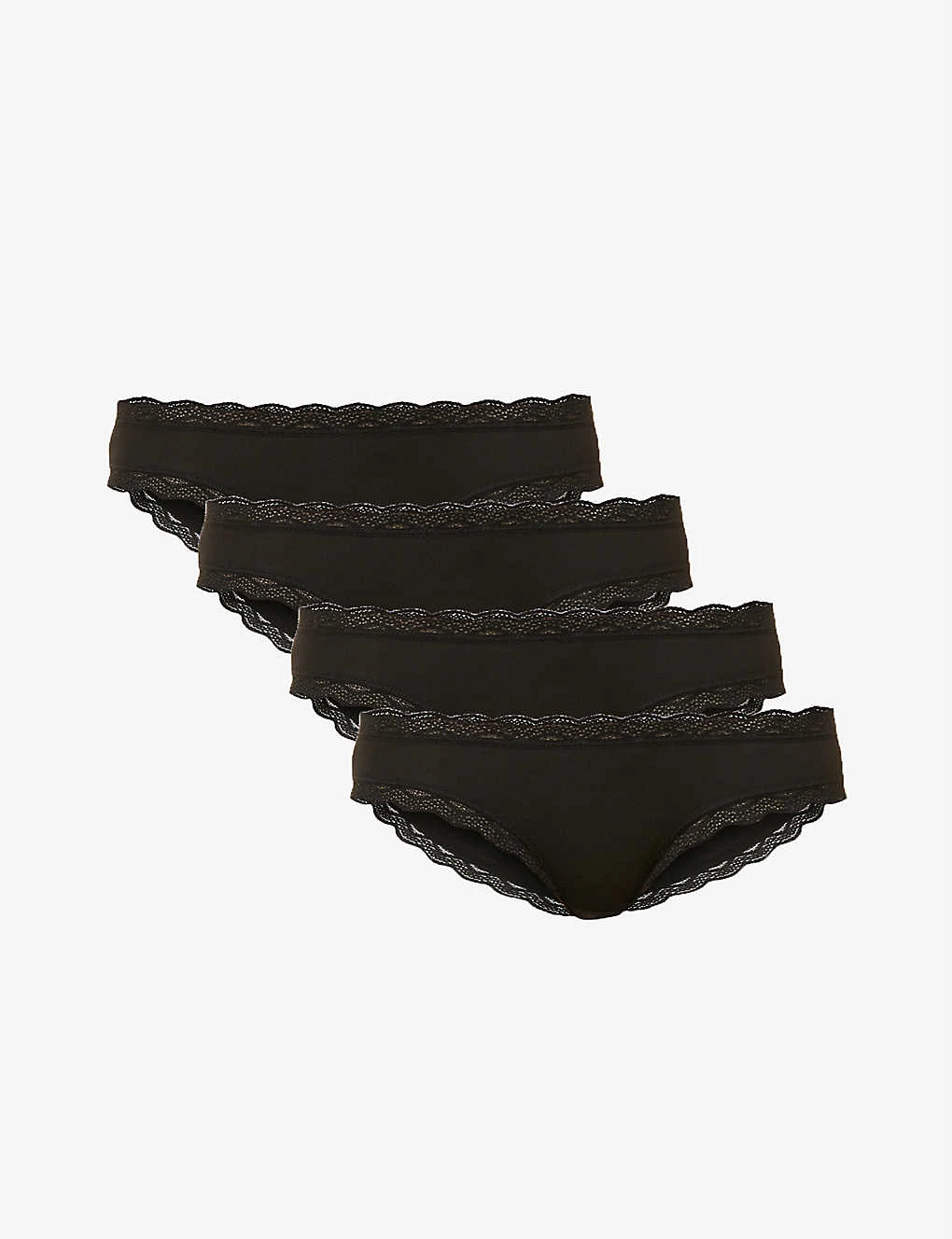- Mid-rise, elasticated waistband, lace trims, mid-coverage at back