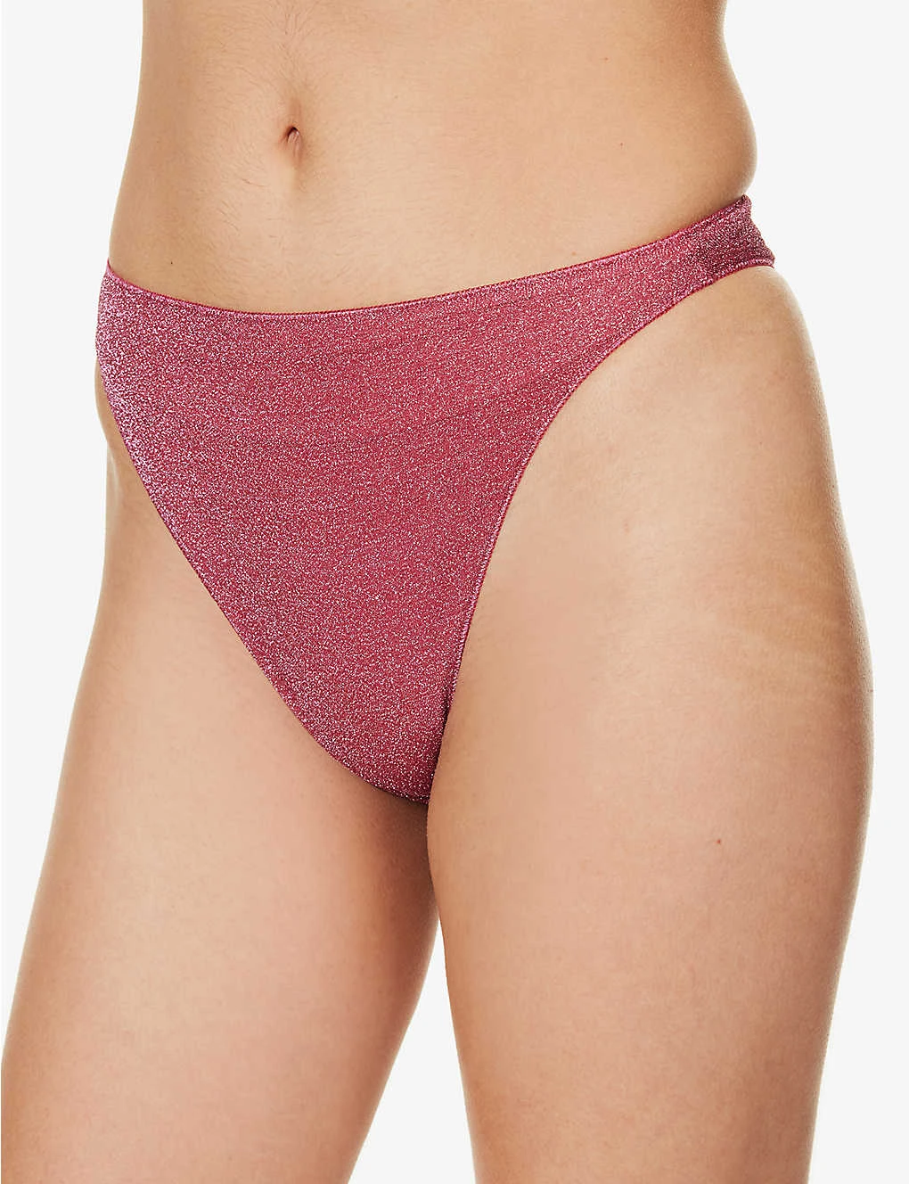 - Regular-fit, mid-rise, elasticated waistband, all-over metallic weave, high leg, mid-coverage at back, fully lined
