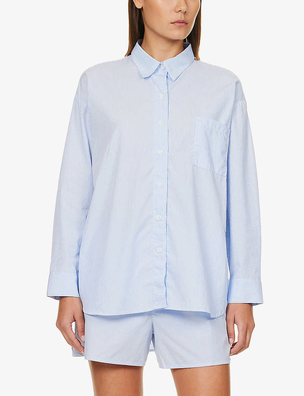 - Relaxed fit, collar, long sleeves, buttoned cuffs, patch pocket at chest, embroidered branding at front, all-over stripe pattern, dipped hem