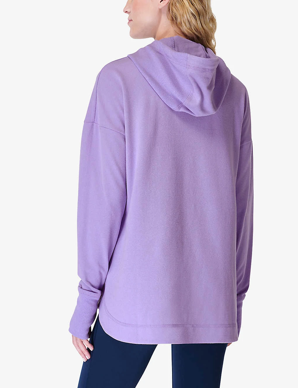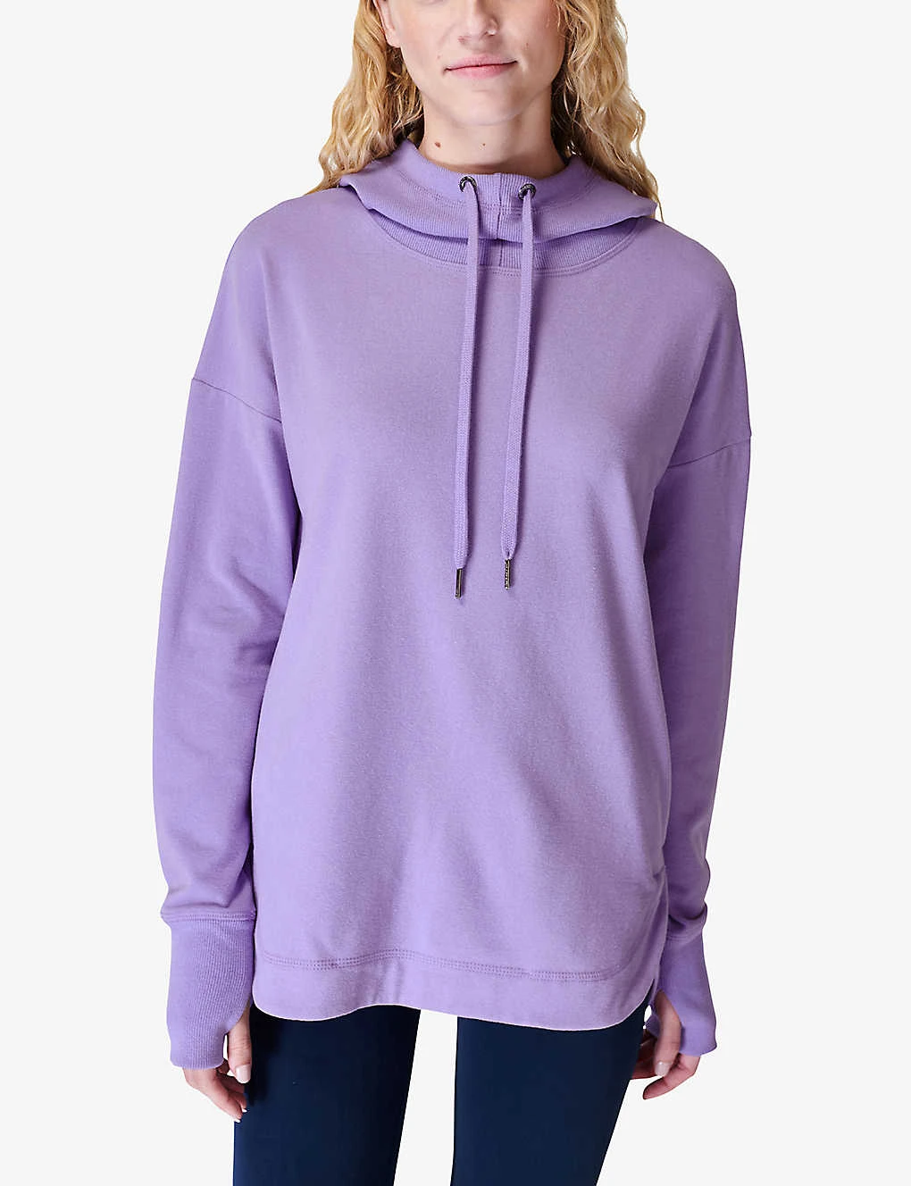 - Drawstring hood, funnel neck, dropped shoulders, long sleeves, embossed branded tab at front hem, curved hem